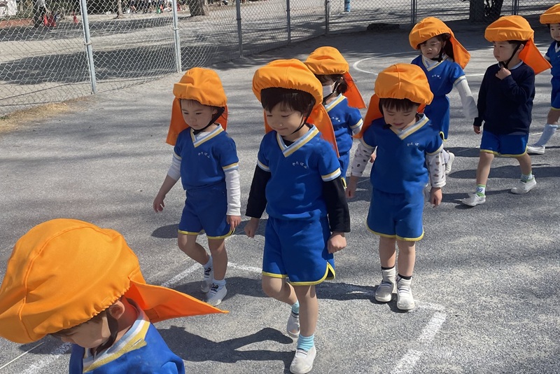 月に1度、地震、火事、不審者侵入を想定した訓練を行っています。教職員は、毎年、『AED』や消火器等の取り扱い方についての訓練を、小学校と合同で行っています。また、年1回、大震災を想定した引き渡し訓練を行うなど、幼児の安全対策には、万全を期しています。なお、正門は登降園時以外は施錠し、外部からの無断侵入を防いでいます。